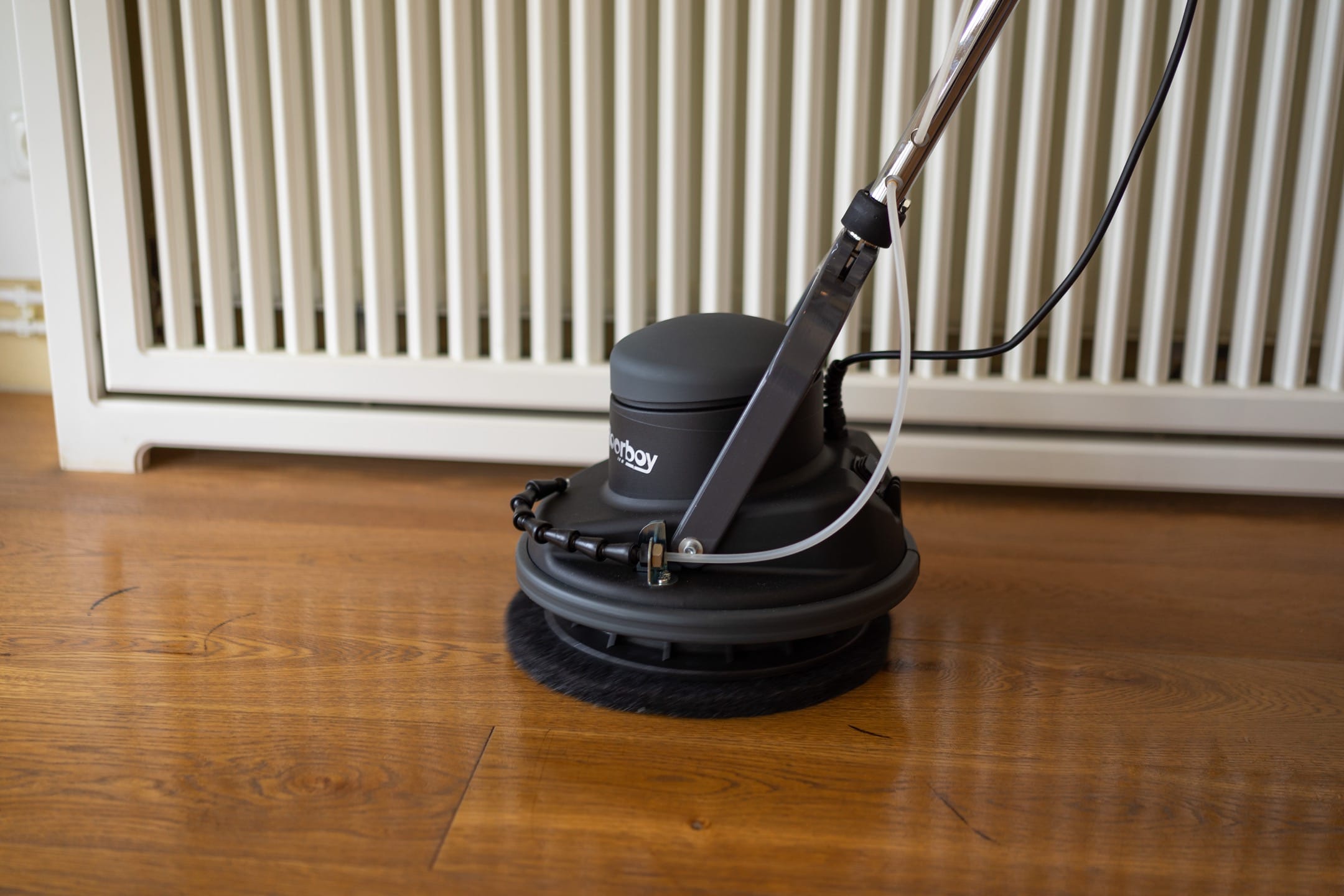 Mit unserem Floorboy und einem schwarzen Reinigungspad wird das aufgetragene Öl nun sanft einmassiert. Bei empfindlichen Böden sollten Sie ein weicheres, wie z. B. das grüne Pad verwenden. Dabei wird die verschmutzte Öl- Wachsschicht angelöst und es bilden sich Öl-Schmutzschlieren. Hierbei gibt es kaum Spritzgefahr für Ihre Möbel, da die Poliermaschine sehr langsam, sauber und präzise arbeitet. Das aufgetragene Öl sollte solange verwendet werden, bis es eine dunkle Farbe erreicht hat.