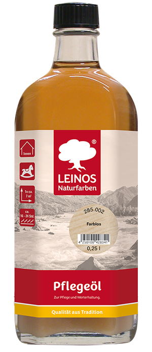 Mit Hartwachsöl behandelte Böden mit Pflanzenseife 930 (max. 10-30 ml in 10 l Wischwasser geben, feucht, nicht nass anwenden) reinigen und bei Bedarf (wenn Abnutzungserscheinungen auftreten) mit Pflegeöl 285 pflegen. Stark strapazierte Oberflächen (Schulen, Büros etc.) erhalten 4 Wochen nach dem letzten Auftrag mit Hartwachsöl eine erste Grundpflege mit Pflegeöl 285, nachdem der Boden mit Pflanzenseife 930 gereinigt wurde. Die weitere Unterhaltspflege mit Pflegeöl erfolgt je nach Erfordernis.